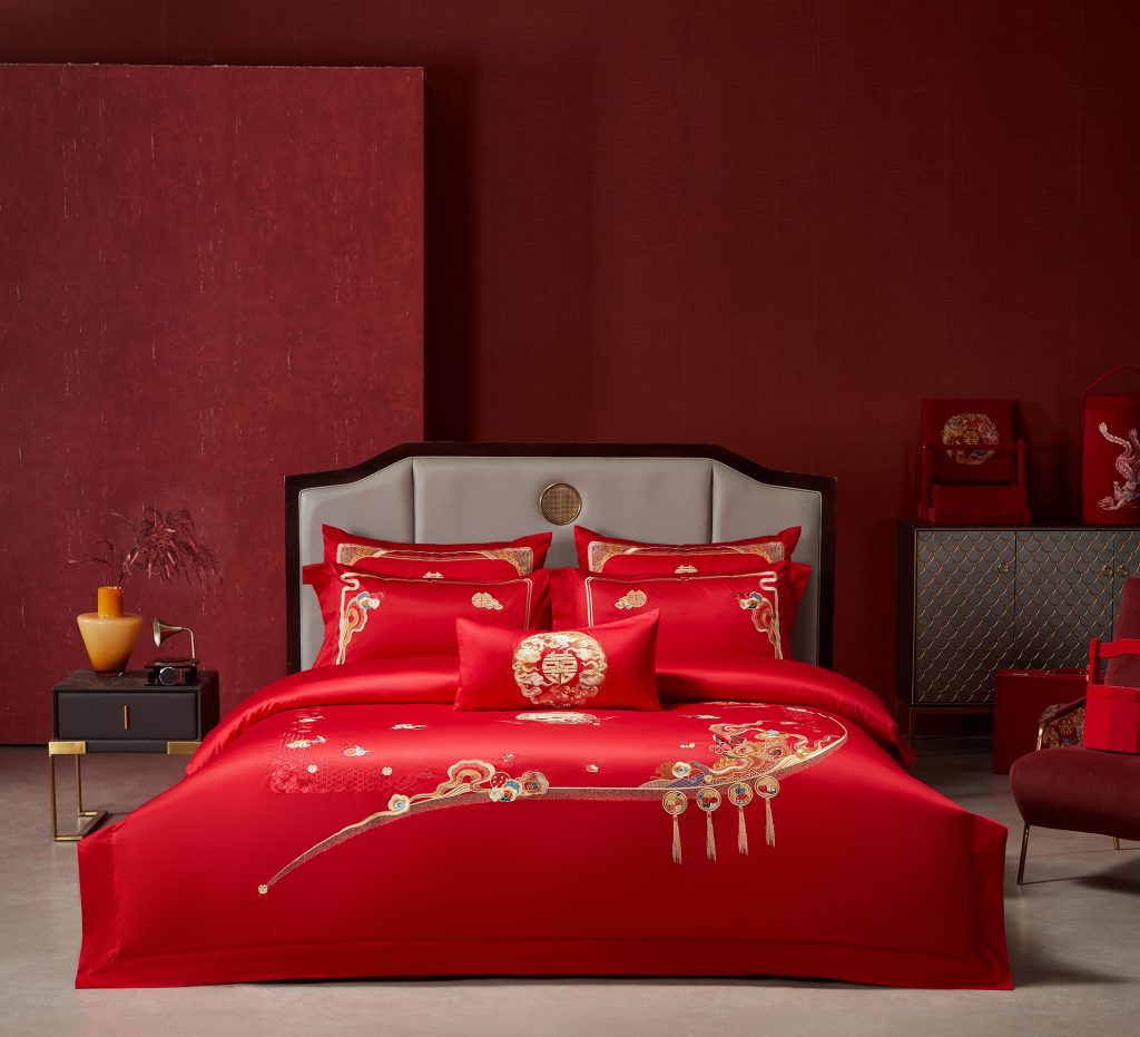 婚庆床品一直都是博客家纺的重心产品正通过差异化设计、科技研发和文化融合来深度耕耘喜被市场,以满足新人对情感、健康和审美的多重需求。